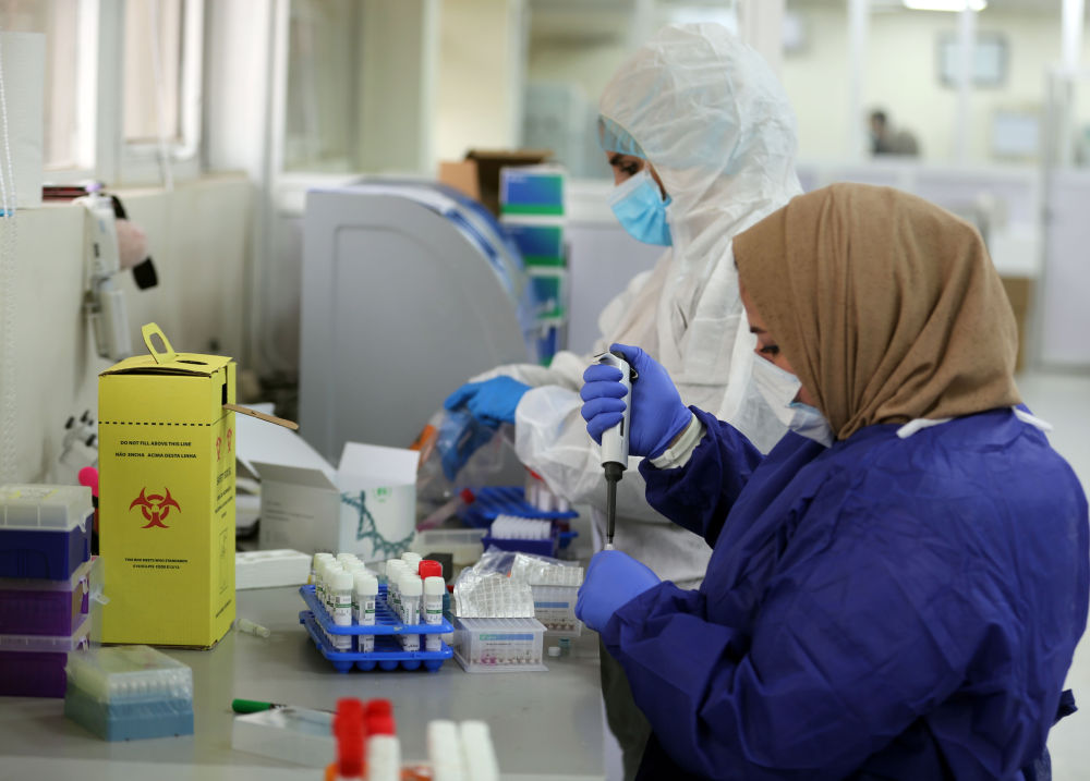 11月8日,在伊拉克巴格達,工作人員在中國援建伊拉克抗擊新冠疫情的核酸檢測實驗室裏檢測樣本。新華社發