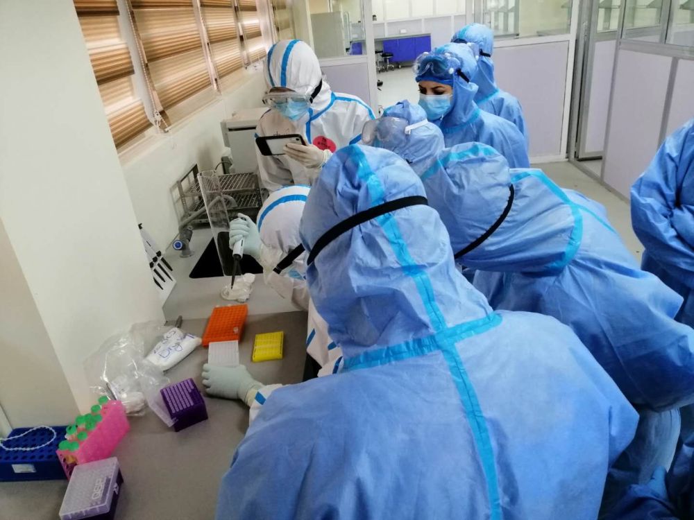 3月26日,張淼(持手機者)在中國援建伊拉克抗擊新冠疫情的核酸檢測實驗室內拍攝質控測試和檢測培訓。(記者本人供圖)