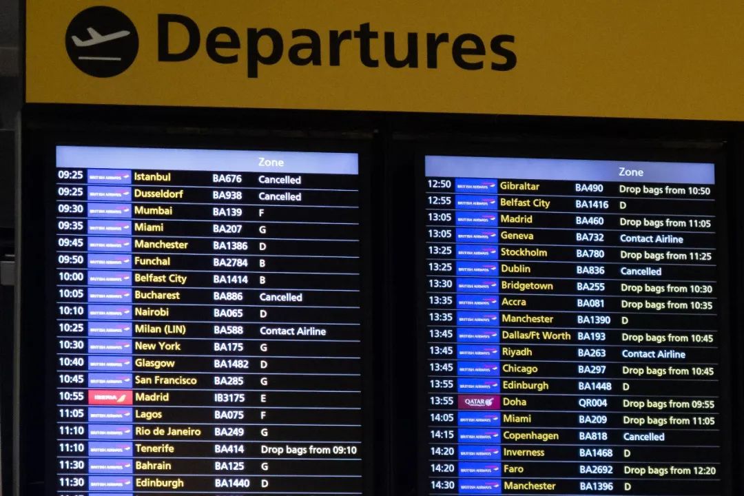 12月21日,英國倫敦希思羅機場第五航站樓內顯示多趟航班被取消。新華社發(蒂姆·愛爾蘭攝)