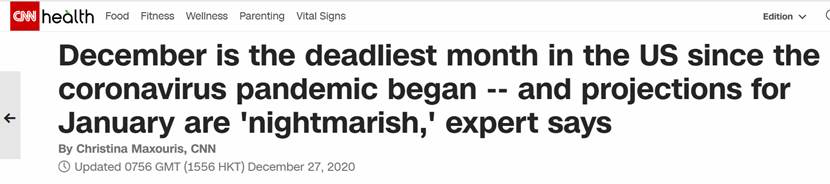【環球網報道 記者 王芊潤】距離2021年還有不到一個星期的時間,據美國有線電視新聞網(CNN)27日報道稱,自新冠疫情爆發以來,12月成了美國(因新冠)死亡人數最多的一個月,而在這過去的26天裏,超過6.3萬美國人死於新冠。儘管這樣,貝勒醫學院傳染病專家還警告稱,接下來兩個月的死亡人數預測“簡直是噩夢”。
