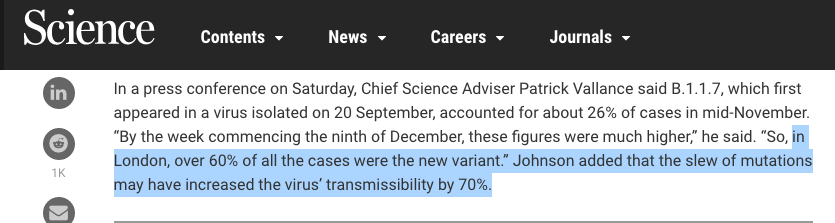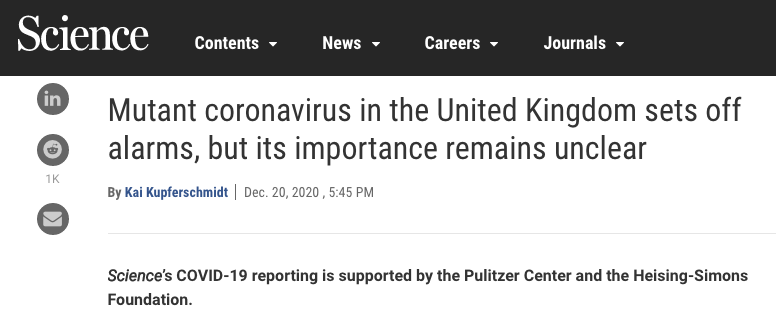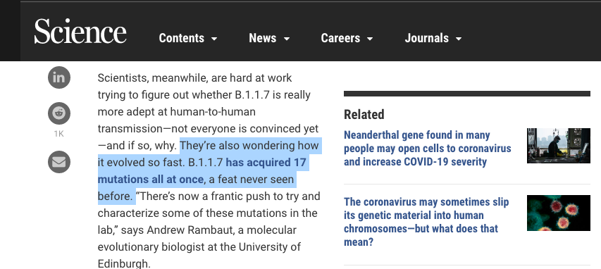 《科學》雜誌報道截圖:B.1.1.7變種病毒已出現17個位點突變。