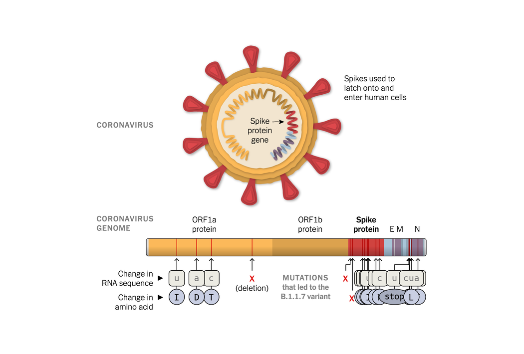B.1.1.7新冠變種病毒示意圖(圖片來源:《紐約時報》)