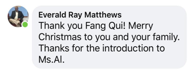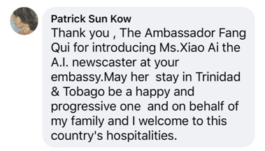 “感謝方大使介紹使館的AI信息播報員小艾女士。祝她在特立尼達和多巴哥生活幸福、有所收穫。我代表我的家人歡迎她來到這個熱情好客的國家。”