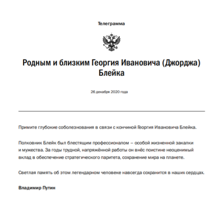 當地時間26日,俄羅斯總統普京致電當天逝世的蘇聯傳奇特工喬治·布萊克的家人。在電文中普京指出,喬治·布雷克上校是一位出色的特工,具有無與倫比的活力和勇氣。普京説,通過多年來艱苦、繁重的工作,喬治·布萊克為實現大國戰略平衡和實現世界和平做出了寶貴貢獻,這個傳奇人物的光輝記憶將永遠留在世人心中。