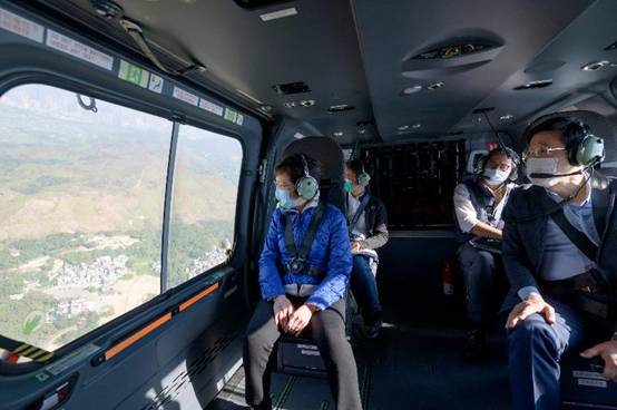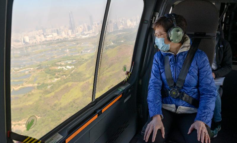 林鄭月娥一行其後乘坐直升機,俯瞰機場三跑填海工程、東涌填海工程、屯門西土地規劃、龍鼓灘、邊境口岸發展(特別是皇崗/落馬洲和羅湖管制站)、北環線沿線等,瞭解該等地區現時的情況。