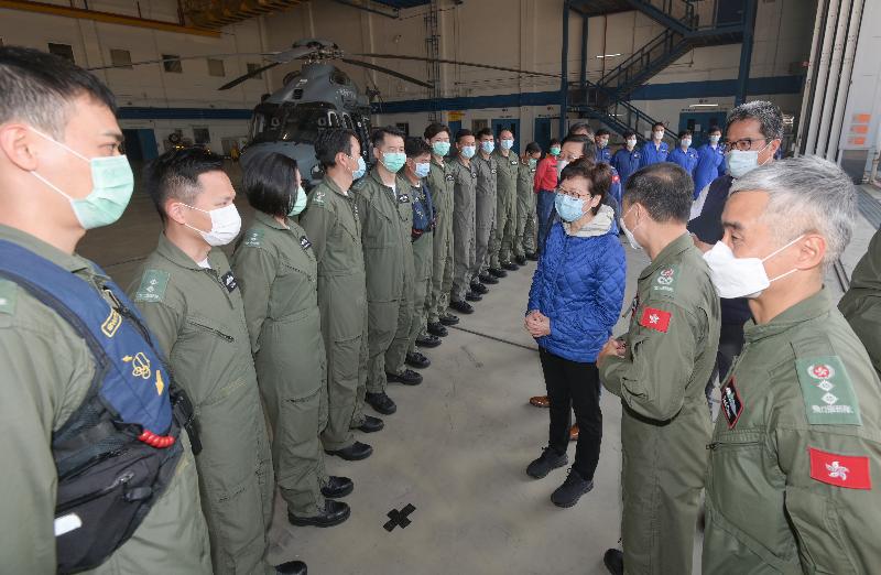 林鄭月娥一行先到訪政府飛行服務隊總部,聽取總監胡偉雄機長介紹政府飛行服務隊的編制和日常工作,以及新一代購入的直升機的性能。林鄭月娥讚揚政府飛行服務隊專業、勇敢,為政府各部門提供支援,並肩負救急扶危的重任,今年頭11個月已處理接近2500次空中救護、搜索和救援以及滅火任務,表現卓越。她鼓勵政府飛行服務隊繼續無懼困難和挑戰,為市民提供最好的服務。