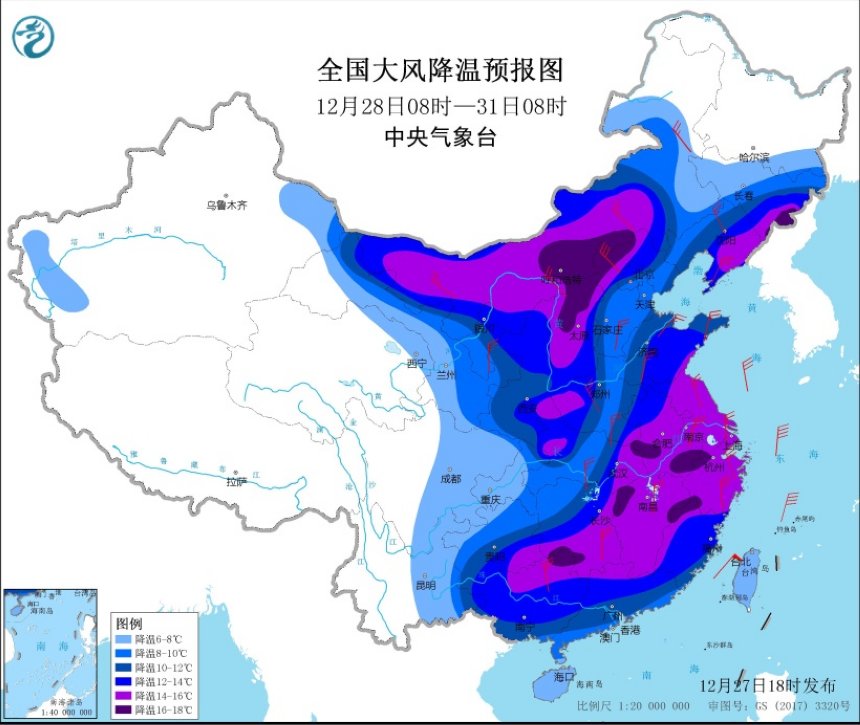 預計27日20時至29日20時,西北地區中東部、華北、東北地區東南部、黃淮、江淮、江漢、西南地區東部、江南等地氣温將下降6℃以上,其中,內蒙古中西部、陝西北部、山西北部、河北北部、吉林東部等地將下降10~14℃,局地降温幅度可達16℃以上,上述地區並伴有4~6級偏北風,陣風可達7~8級;29日早晨,華北平原氣温降至-4~-8℃,黃淮至關中平原氣温降至0~-4℃。