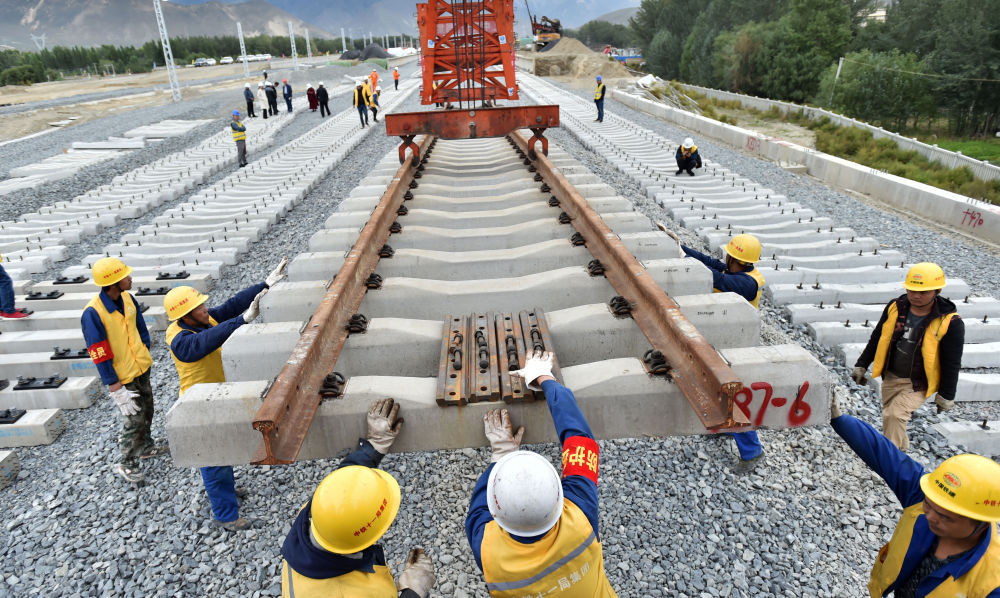 在川藏鐵路拉薩至林芝段,工人進行鋪軌作業(2019年9月2日攝)。新華社記者 覺果 攝