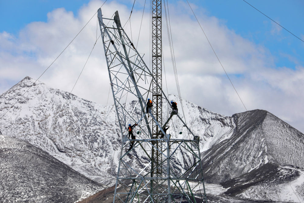 在西藏日喀則市定日縣,施工人員在西藏阿里與藏中電網聯網工程線路4標段作業(2020年4月28日攝)。 新華社發