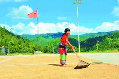 曼班三隊村民在晾曬稻穀。陳啓發攝