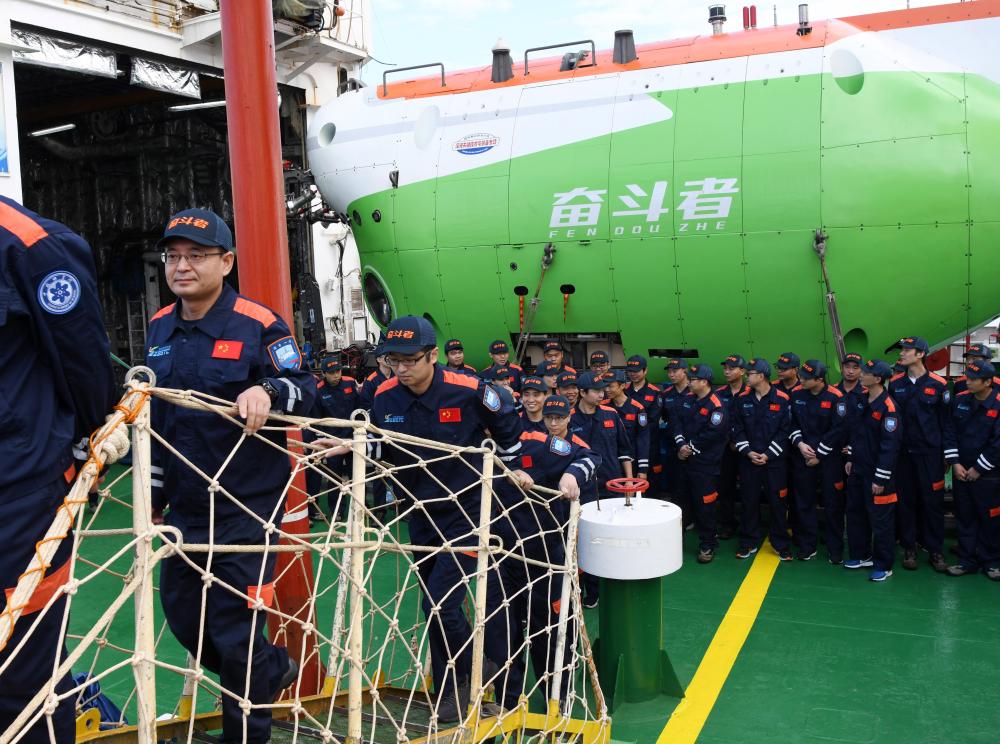 11月28日,在海南省三亞市南山港,在馬裏亞納海溝成功實現10909米坐底紀錄的“奮鬥者”號載人潛水器隨“探索一號”科考船勝利返航。 新華社記者 陳凱姿 攝