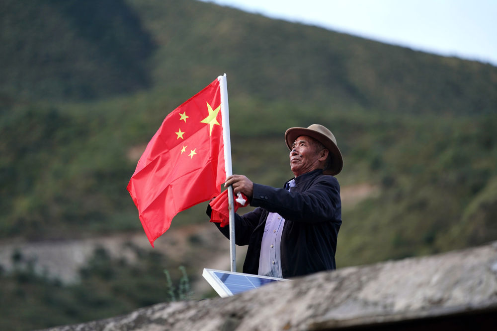 9月25日,在西藏昌都市江達縣崗託村,普巴在屋頂上換上嶄新的國旗,這是他每月進行一次的“儀式”。今年是昌都解放70週年,普巴説,現在我們的美好日子,是解放軍用生命和鮮血換來的,這份恩情,我們不會忘記。新華社記者 詹彥 攝