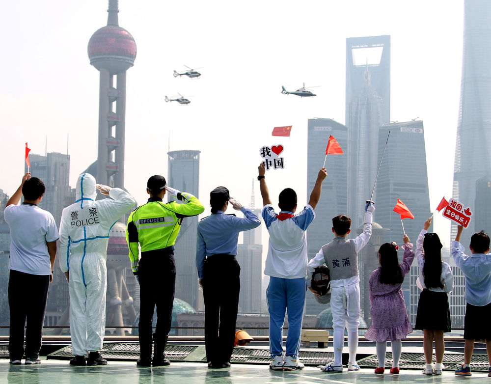 10月1日,警用直升機懸掛着五星紅旗飛過上海黃浦江上空。新華社記者 陳飛 攝
