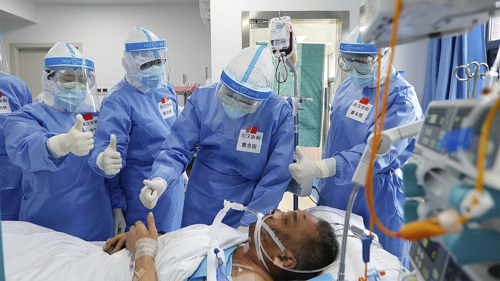 5月8日,武漢協和醫院醫務人員向新冠肺炎患者成功撤除ECMO表示祝賀。新華社發