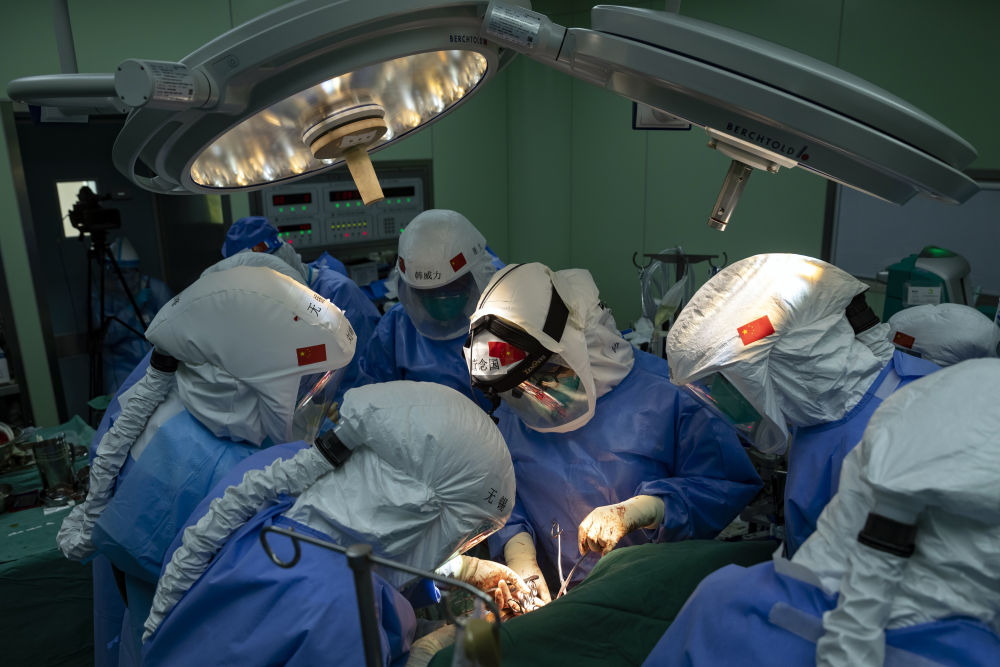 4月24日,武漢協和醫院器官移植中心主任董念國(中)為新冠肺炎患者實施肺移植手術。新華社記者 沈伯韓 攝