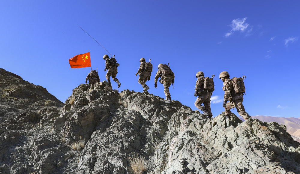 10月1日,西藏阿里軍分區某邊防團巡邏分隊官兵沿山脊向點位行進。新華社發(劉曉東 攝)