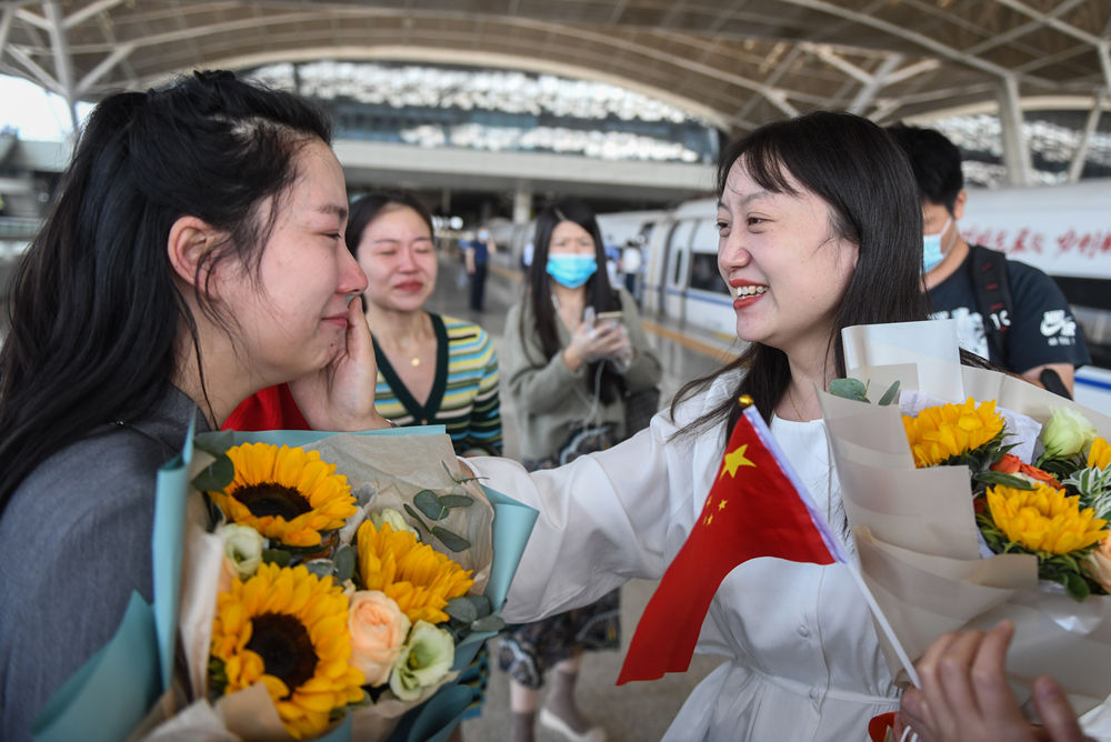 10月1日,一批馳援過武漢抗疫的江蘇醫療隊隊員重回武漢,曾經並肩戰鬥的江蘇援鄂醫療隊員吳衞娟(右)和武漢市江夏中醫院的董璇(左)再度相逢,喜極而泣。新華社記者 程敏 攝