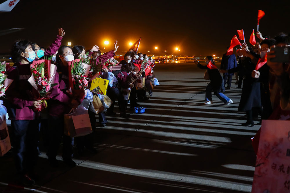 4月15日,北京協和醫院國家援鄂抗疫醫療隊隊員在撤離前集結。面對突如其來的疫情,4萬多名來自全國各地的醫務工作者集結湖北,與當地醫務人員一道,展開了一場艱苦卓絕的湖北保衞戰。新華社記者 熊琦 攝