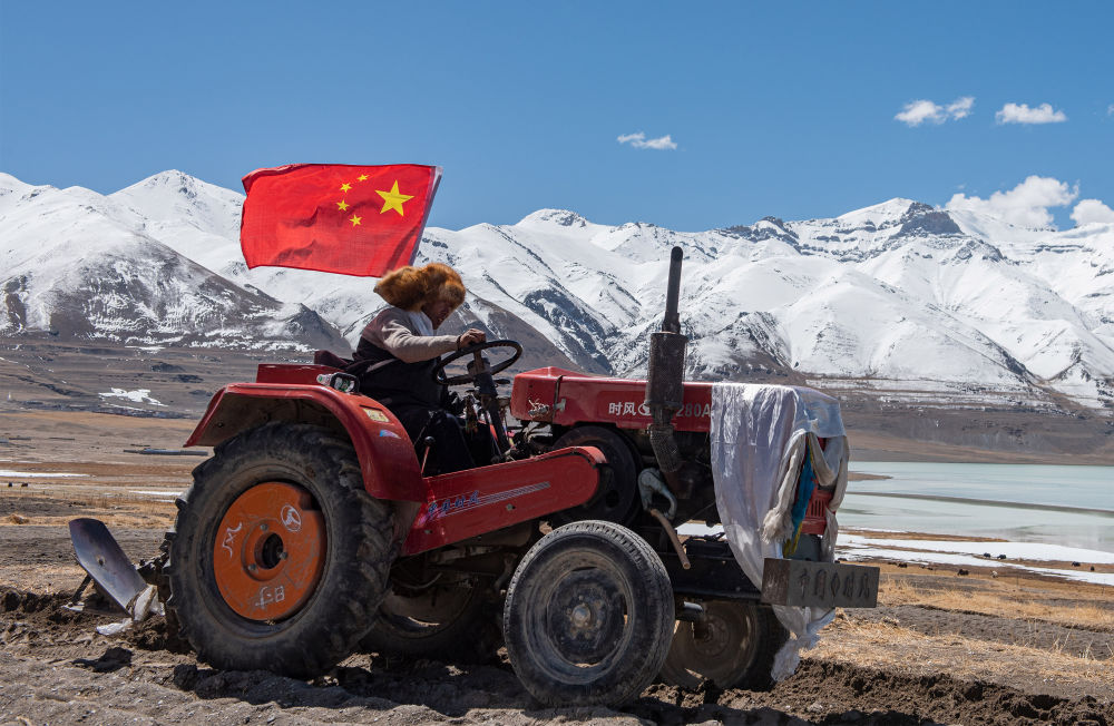 4月30日,拖拉機在西藏那曲市尼瑪縣當穹錯旁舉行的春耕典禮上行進。新華社記者 侯捷 攝