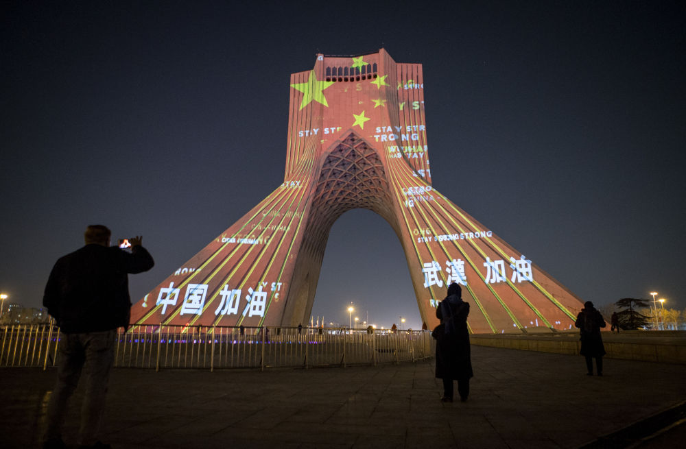 2月18日,伊朗首都德黑蘭地標建築自由塔上演燈光秀,為中國抗擊疫情加油。新華社發(艾哈邁德·哈拉比薩斯攝)