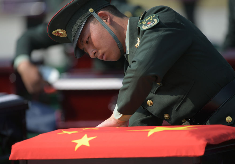 9月27日,在瀋陽桃仙國際機場,禮兵在殮放志願軍烈士遺骸的棺槨上蓋上國旗。當日,第七批在韓中國人民志願軍烈士遺骸由中國空軍專機護送從韓國接回遼寧瀋陽。新華社記者 楊青 攝
