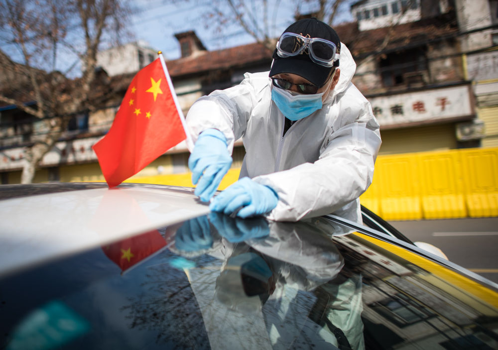 2月29日,“W大武漢緊急救援隊”隊員朱偉將國旗插在車上。疫情期間,由志願者組成的“W大武漢緊急救援隊”接送缺乏交通工具去醫院的待產孕婦,成為即將出生的新生命的“擺渡人”。新華社記者 肖藝九 攝