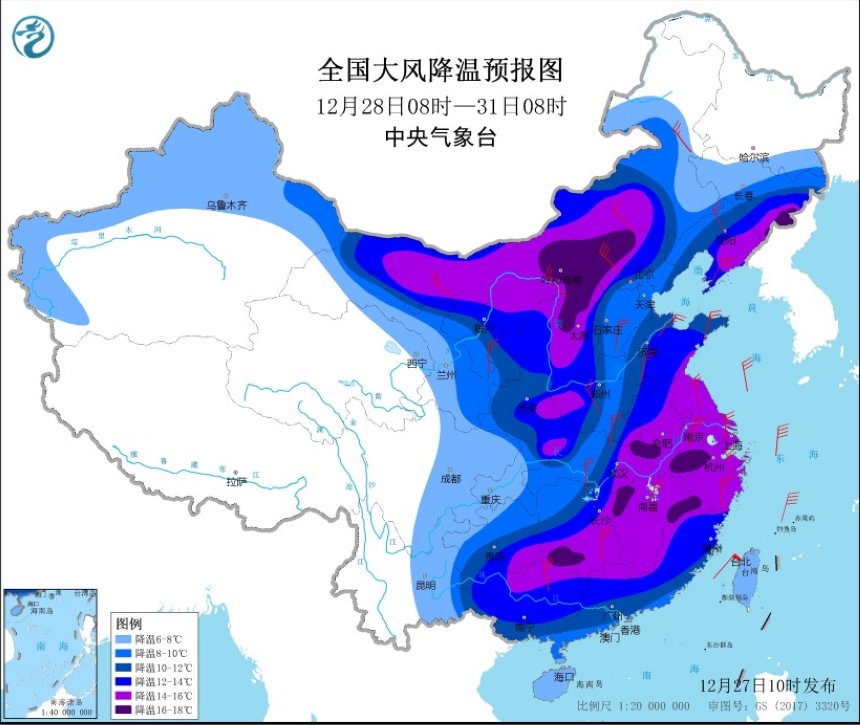 根據中央氣象台今天上午10時發佈的寒潮黃色預警,27日起,強冷空氣將自西向東、自北向南影響我國中東部大部地區,帶來大風和強降温天氣。預計28日至31日,中東部大部地區氣温將下降10℃左右,西北地區東部、東北地區東南部、華北西部和北部、黃淮南部、江淮、江南、華南中北部等地降温12~16℃,局地降温幅度可達16℃以上,上述地區將有4~6級、陣風7~9級偏北風,我國東部和南部海區有7~9級、陣風10~11級偏北風;降温過後,最低氣温0℃線將南壓至華南北部一帶,最低氣温-10℃線在黃河下游到秦嶺一帶。