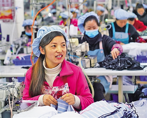 位於含山縣的海達服飾公司泳裝生產線,員工在趕訂單。該縣每年開發3000多個就業新崗位,專門吸納返鄉農民和貧困勞動者就業。