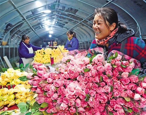 安徽省含山縣銅閘鎮太湖村鑫玫沅鮮花合作社,花農俞成麗(右)在包裝採摘的玫瑰花。當地大力發展生態特色產業,種植的玫瑰花供不應求。