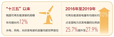 水流奔湧而下、風機呼呼轉動、光伏板熠熠生輝……“十三五”以來,我國可再生能源裝機規模年均增長約12%,水電、風電、光伏發電裝機容量均居世界首位;截至2019年,煤電裝機佔全國電力總裝機容量的比例為51.95%,較2015年下降7.05個百分點。能源供應體系正由以煤炭為主向多元化轉變,可再生能源逐步成為新增電源裝機主體。
