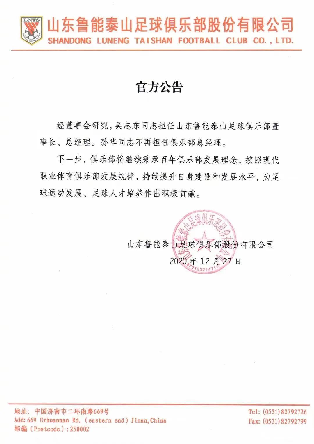 12月27日,山東魯能泰山足球俱樂部股份有限公司連發兩則公告:吳志東同志擔任俱樂部董事長、總經理;孫華不再擔任俱樂部總經理;李霄鵬不再擔任俱樂部副總、技術總監。