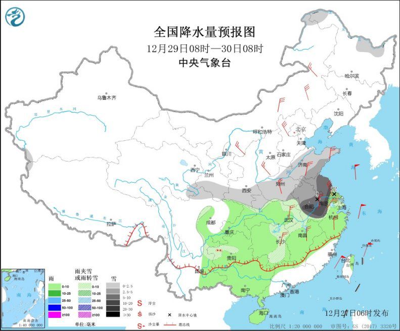 12月29日08時至30日08時,黑龍江北部、西北地區東南部、黃淮、江淮、江南北部、貴州西北部等地有小到中雪或雨夾雪,其中,安徽中南部、江蘇中北部部分地區有大到暴雪。貴州西北部局地有凍雨。西南地區東部、江漢、江南、華南西部等地有小雨。中東部大部地區有4~6級風,陣風7~9級(見圖7)。