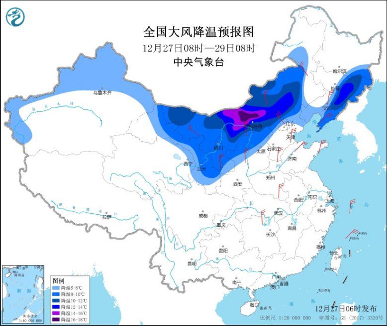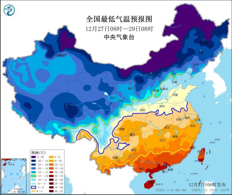 中央氣象台12月27日06時發佈寒潮黃色預警:27日白天起,強冷空氣將開始影響新疆北部,未來將自西向東自北向南影響我國中東部大部地區,帶來大風和強降温天氣。預計28日至31日,中東部大部地區氣温將下降8~10℃,西北地區東部、東北地區東南部、華北西部和北部、黃淮南部、江淮、江南、華南中北部等地降温12~14℃,局地降温幅度可達14℃以上(圖1);降温過後,最低氣温0℃線將南壓至華南北部一帶,最低氣温-10℃線在黃河下游到秦嶺一帶(圖2);