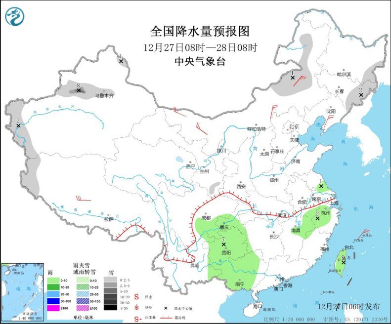 12月27日08時至28日08時,新疆沿天山地區和西南部、內蒙古東部、東北地區東部等地的部分地區有小到中雪,其中,新疆伊犁河谷等地局部地區有大雪(5~8毫米)。西南地區東部、華南西部、江南東部等地的部分地區有小雨。內蒙古大部等地有4~6級風(見圖5)。