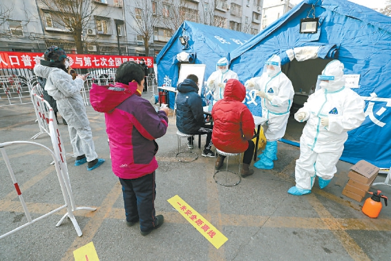 12月26日上午,在順義區勝利街道檢測點,醫護工作者正對義賓南區附近居民咽拭子樣本進行採集,開展核酸檢測。本報記者 武亦彬攝