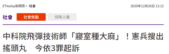 【環球網綜合報道 記者 趙友平】據台媒12月26日消息,台灣“中山科學研究院”遭毒品入侵,導彈所謝姓技術師自稱工作壓力大,在單人宿舍內栽種起大麻,結果因照明、空調設備導致用電量大增露餡,其宿舍內被起獲13株活體大麻,甚至還發現搖頭丸等。台灣檢方近日依私運管制物、製造及持有第二級毒品等三罪將謝起訴。