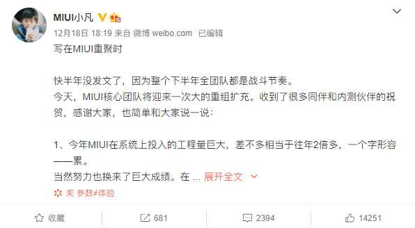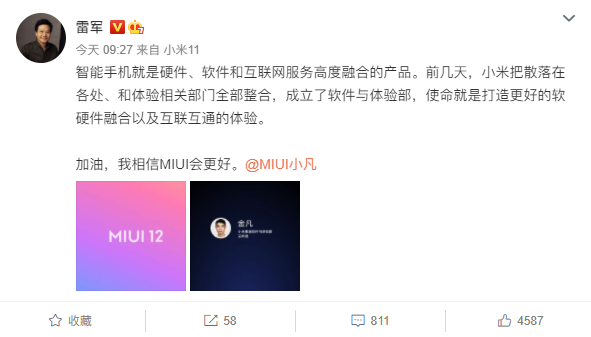 今天上午,小米公司創始人雷軍在微博發文稱:“智能手機就是硬件、軟件和互聯網服務高度融合的產品。前幾天,小米把散落在各處、和體驗相關部門全部整合,成立了軟件與體驗部,使命就是打造更好的軟硬件融合以及互聯互通的體驗。加油,我相信MIUI會更好。”