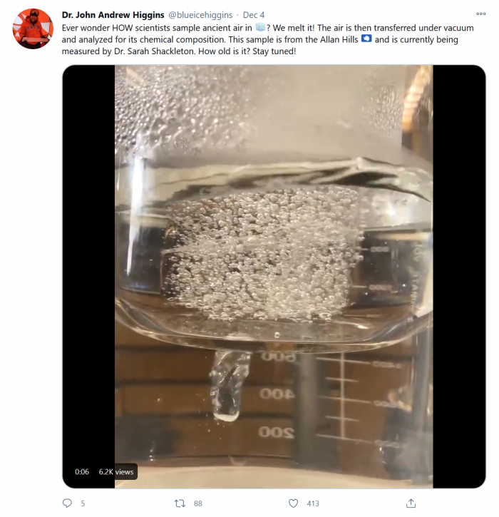 另一個發現的樣本則有200萬年的歷史,其保存狀況良好,其中的氣泡被用來測量二氧化碳和甲烷等温室氣體。這些樣品的質量足以讓我們瞭解當時的大氣狀況。Higgins博士最近在Twitter上發佈了一段展示古代的冰正在融化的視頻。可以看到,其中的氣體正從古代的水中冒出來。