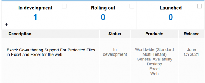 微軟正計劃增加對受保護的Excel文件的共同作者的支持。新功能將允許用户使用密碼保護Excel文件,並仍可與其他人分享,後者可以在不取消保護的情況下編輯文件。 該功能最近被添加到微軟的Office開發路線圖中,將同時適用於微軟Excel在線應用和桌面應用。