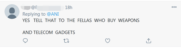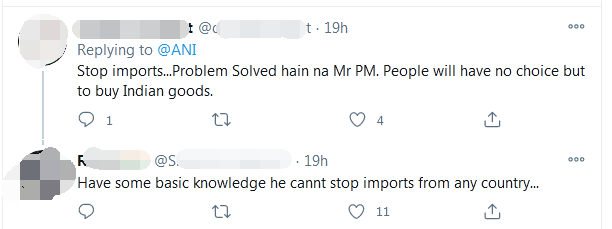 更有網友略帶諷刺説,“停止進口…… 我們總理把問題解決了,民眾將沒有選擇只能買印度貨”,另有網友回覆説,“沒有基本常識,他(莫迪)不能阻止從任何國家進口……” ↓