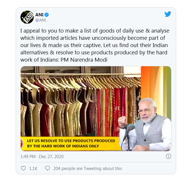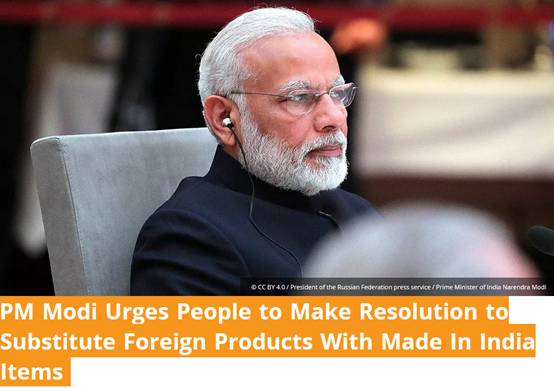 報道稱,莫迪當天在廣播節目“Mann Ki Baat”(今年最後一期節目)中向全印發表講話説,希望人民在新的一年為了這個國家下個決心,呼籲印度人使用印度製造的產品以替代“國外製造”,目的是推進“為本土發聲”(Vocal For Local)運動。