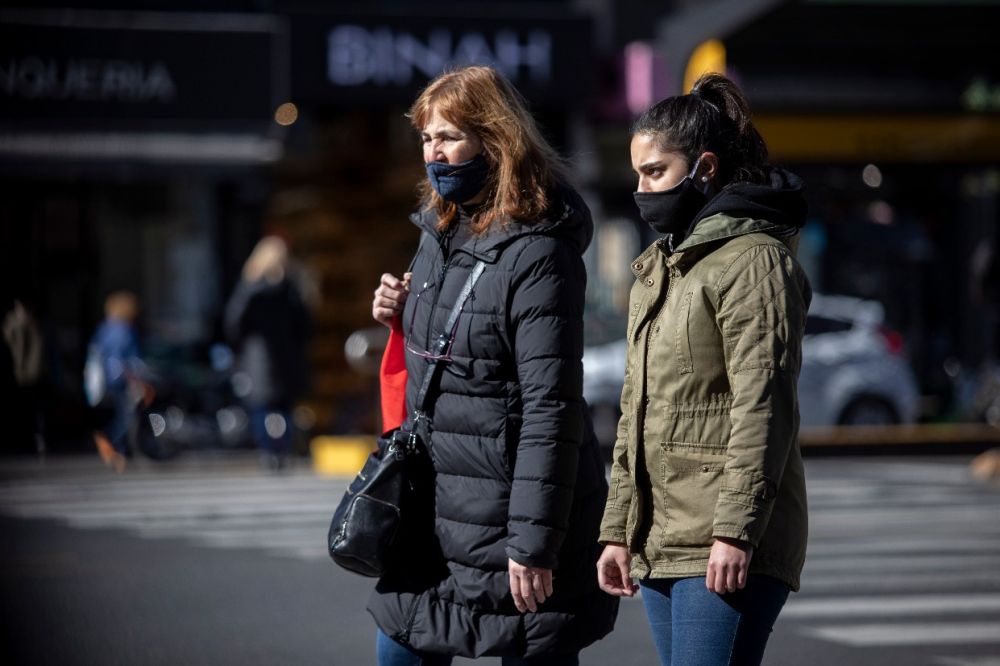 8月11日,在阿根廷布宜諾斯艾利斯,兩名女子戴着口罩出行。(新華社發,馬丁·薩巴拉攝)