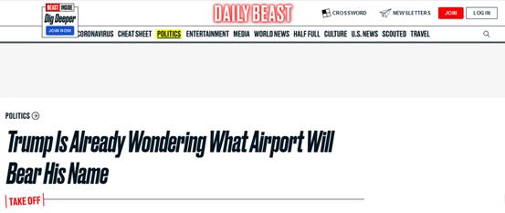 報道稱,一位消息人士透露,在過去3周,特朗普曾表示,“沒有哪位總統”想用他的名字命名一座“聲譽差”或是基礎建設破敗的機場。另一位消息人士則提到,自2020年美國總統選舉以來,特朗普曾隨口提問説,要以一位前總統的名字命名一個機場,需要什麼樣的“文書工作”。
