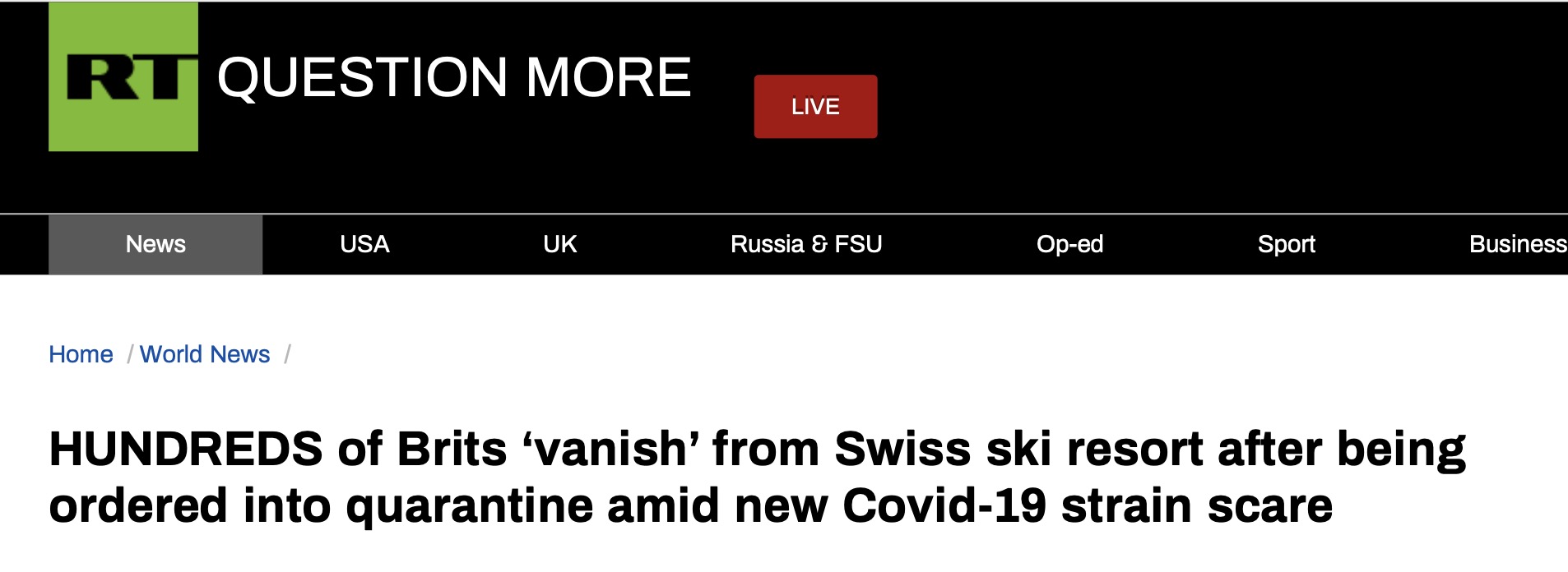 【環球網報道 見習記者 邊子豪】據今日俄羅斯(RT)報道,瑞士巴涅斯市的韋爾比耶滑雪度假勝地的幾百名英國遊客“憑空消失”了。在這之前,因新冠病毒新變種影響,這些遊客被要求隔離十天。