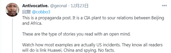 一些網友則認為,“這是一個宣傳貼。美國中央情報局(CIA)以此破壞北京和非洲關係……他們(美國媒體)知道,讀者會把華為、中國和間諜活動聯繫起來。毫無事實依據。”