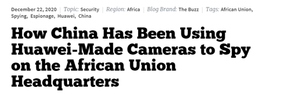 “中國利用華為攝像頭監視非盟總部”,印度《經濟時報》當地時間12月28日援引美國《國家利益》雜誌一篇題為《中國如何一直使用華為製造的攝像頭監視非盟總部》的文章宣稱,中國黑客一直在獲取位於埃塞俄比亞首都亞的斯亞貝巴的非盟總部大樓內的安全攝像錄像。