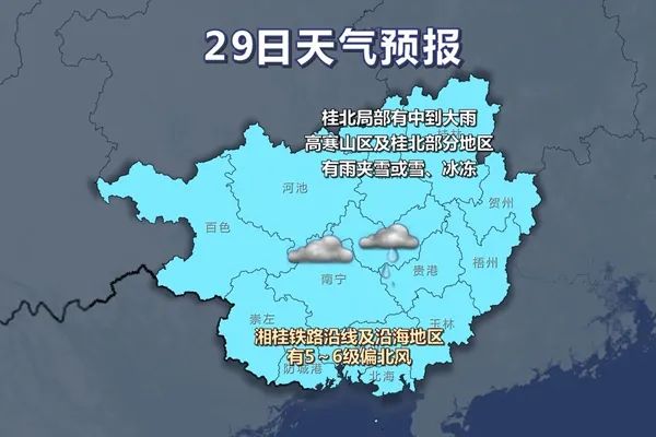 29日, 冷空氣開始影響我區,全區陰天有小雨,其中桂林、柳州、河池局部有中雨到大雨,高寒山區及桂東北部分地區有雨夾雪或雪、冰凍。冷空氣過境時,湘桂鐵路沿線和沿海地區有5~ 6級偏北風。