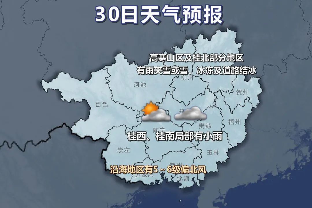 30日, 全區多雲到陰天,其中桂西、桂南局部有小雨,高寒山區及桂北部分地區有雨夾雪或雪、冰凍及道路結冰,沿海地區有5~6級偏北風。