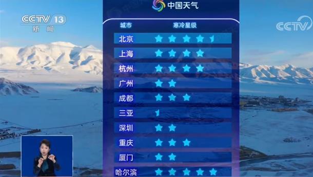 比如哈爾濱跨年當天最低氣温在-27℃左右,皮膚裸露在外有凍傷的風險,寒冷指數五顆星;北京氣温在-10℃以下,體感温度甚至可達-15℃,寒冷指數四星半;上海、杭州的氣温也在冰點以下,寒冷指數四顆星;成都、重慶凍手凍腳,寒冷指數三顆星;廣州、深圳、廈門濕冷感明顯,寒冷指數兩顆星;海南三亞氣温也較常年偏低,獲得半顆星,怕冷的小夥伴恐怕要套件薄羽絨服了。(總枱央視記者 任梅梅)