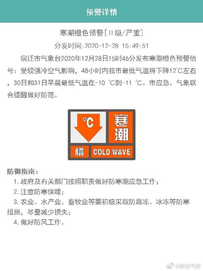 宿遷市氣象台2020年12月28日15時46分發布寒潮橙色預警信號:受較強冷空氣影響,48小時內我市最低氣温將下降12℃左右,30日和31日早晨最低氣温在-10℃到-11℃。市應急、氣象聯合提醒做好防範。